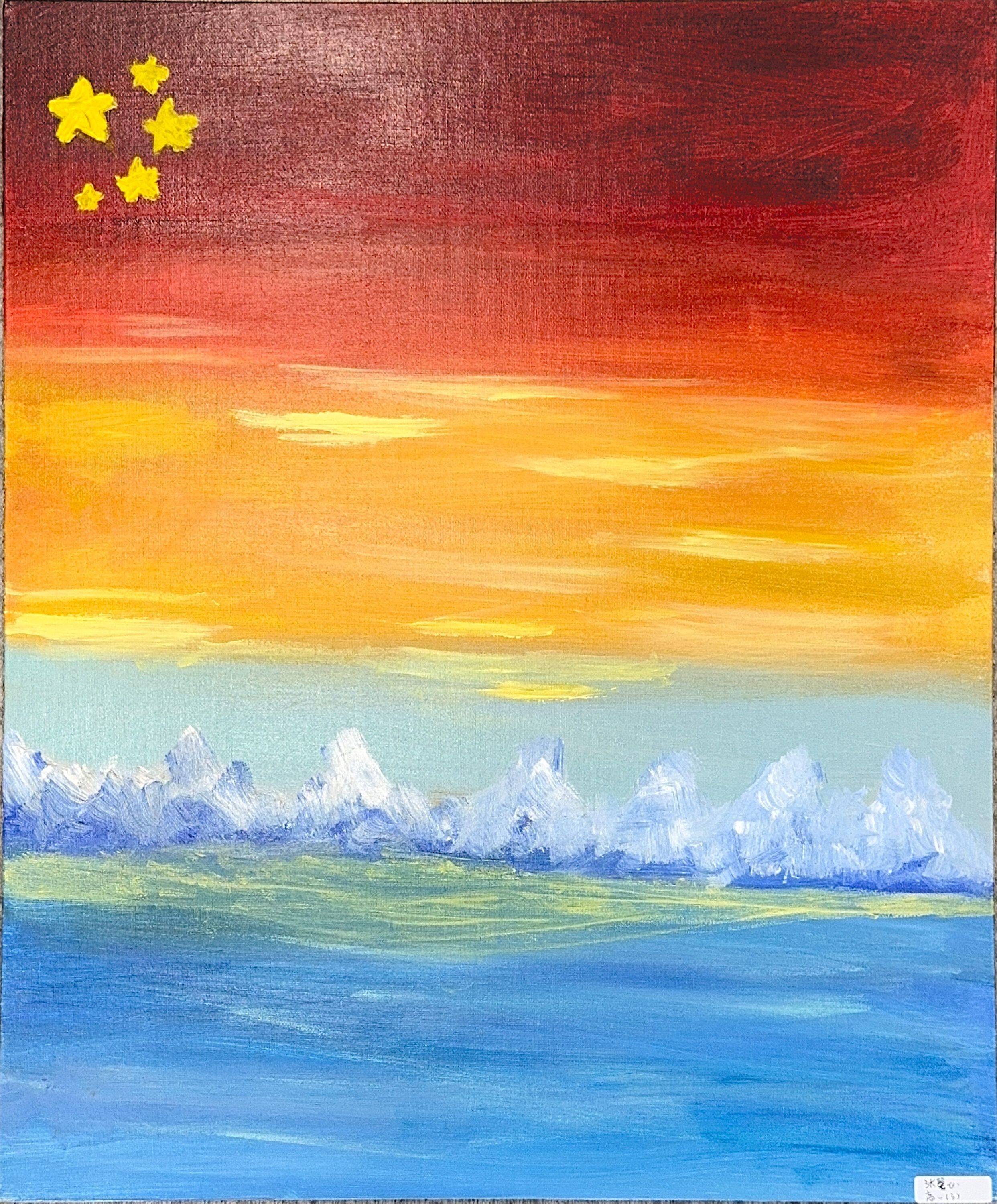 “红霞散天外,掩映夕阳时”将国旗融入满天火烧云元素中,暗含对国泰民安的盛世来之不易的感慨,以景衬托爱国情怀,金色点缀寓意着对未来的展望,充满希望。浅色系使整张画面配色很舒适,给人一种放松的感觉。在此美景下,更能衬出深厚的爱国情怀。