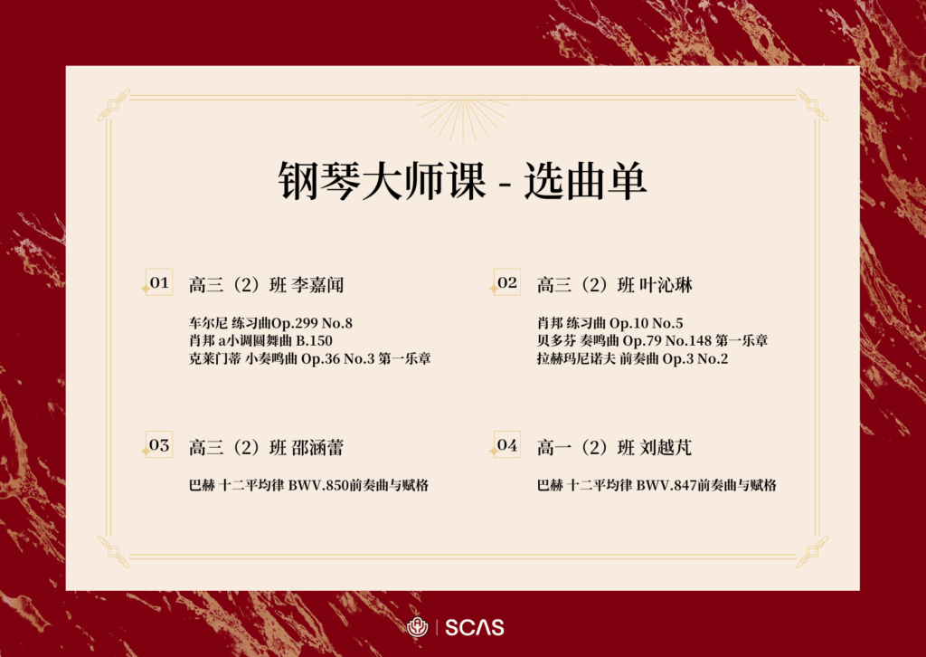 大师课的序幕,由同学们的琴音轻柔揭开。四位学子依次在三角钢琴前落座,展示不同风格的作品。