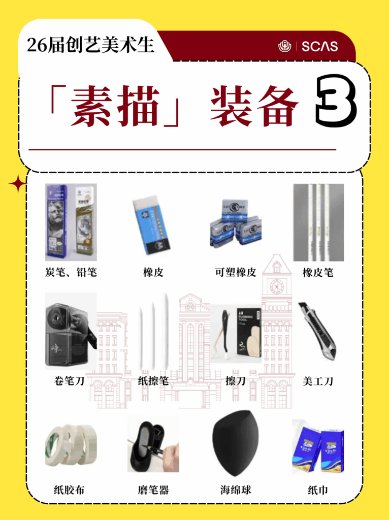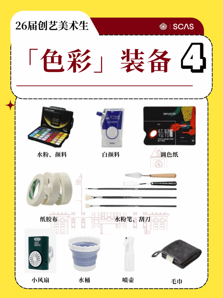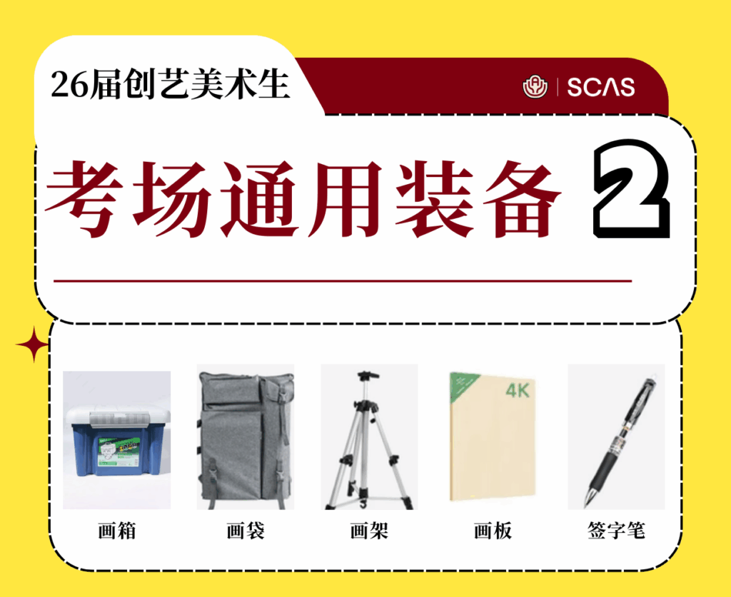 考前每科需要的画具准备齐全,保持和平时使用的画具一致。考试的时候尽量不要准备新画具,可能会影响发挥,平时练的画具会让考生更加熟悉,得心应手。
